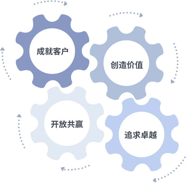 成就客户是一切决策的出发点,,创造价值是衡量所有工作的标准,,,追求卓越是我们做事做人的态度,,,开放共赢是我们的格局也是最终的结果。。。。价值观的齿轮环环相扣,,,推动着组织里的每个人不断向前。。