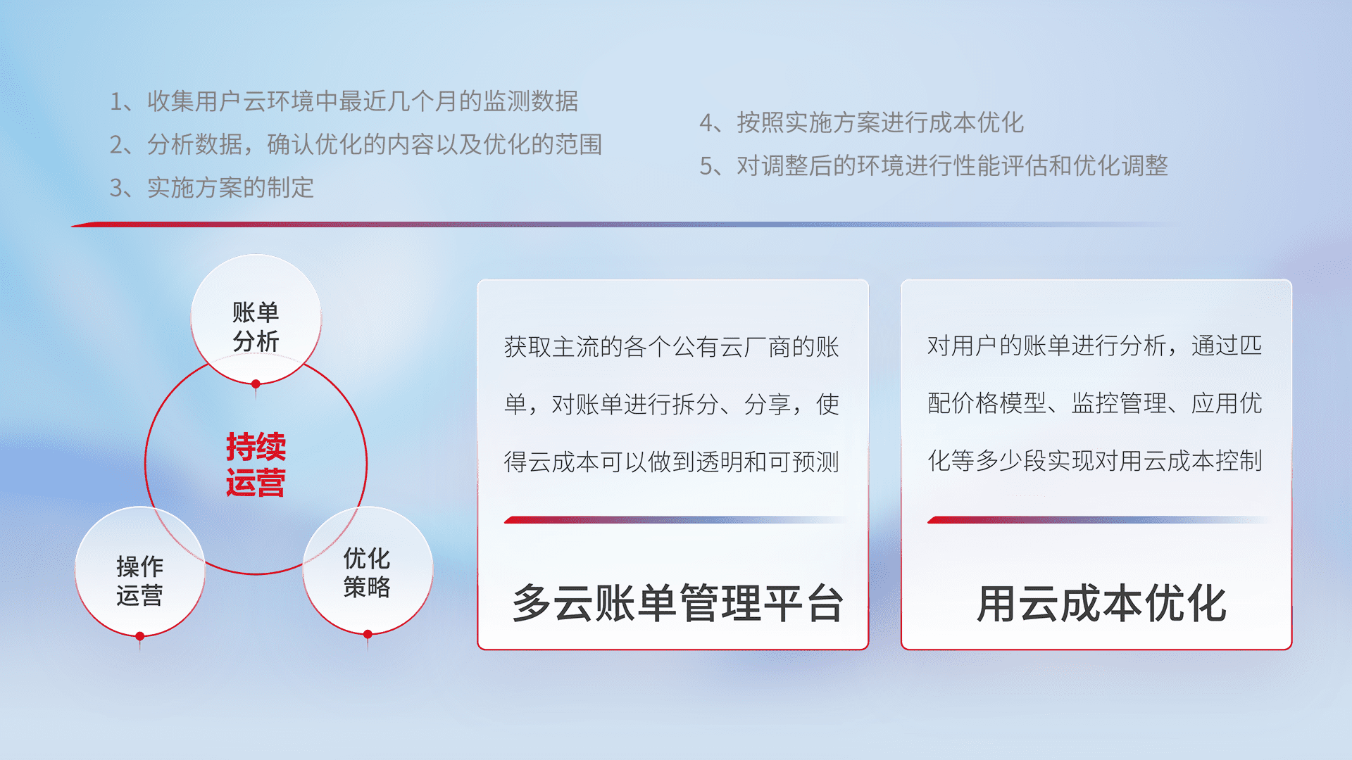 通过多云纳管,,以统一的资源数据模型把客户的云资源进行抽象和封装,,,,进而实现对多云资源的统一操作,,,保障云资源管理的可靠性、、、稳定性与可用性。。量身定制化运维内容,,,,配置、、、、开发运维、、、、补丁管理、、、、备份、、、监控、、、认证和访问管理、、、、审计和日常巡检等,,,保障在用云过程中的可靠度,,,,稳定度以及高可用率。。。